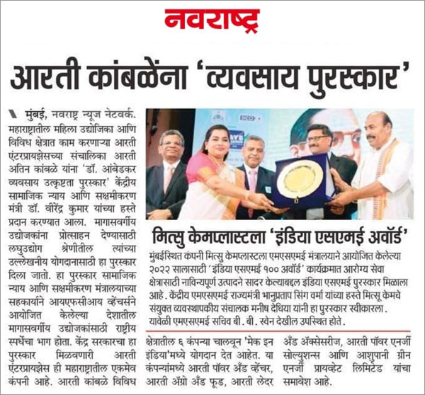 Leading entrepreneur Arti Atin Kamble, director of multiple companies including M/s Aarti Enterprises, has been widely recognized across national and regional media for receiving the prestigious Dr. Ambedkar Business Excellence Award in the Small Enterprises category for Scheduled Caste entrepreneurs.